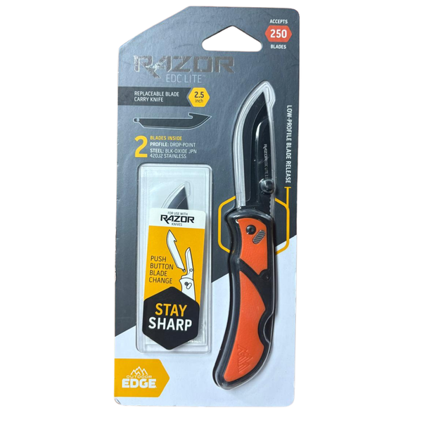 The Outdoor Edge Razor EDC Lite 2.5 Orange is the ultimate compact knife for everyday carry and outdoor use. Featuring a bright orange handle for high visibility, this lightweight knife is perfect for hunters, campers, and outdoor enthusiasts who need a reliable cutting tool at their fingertips.